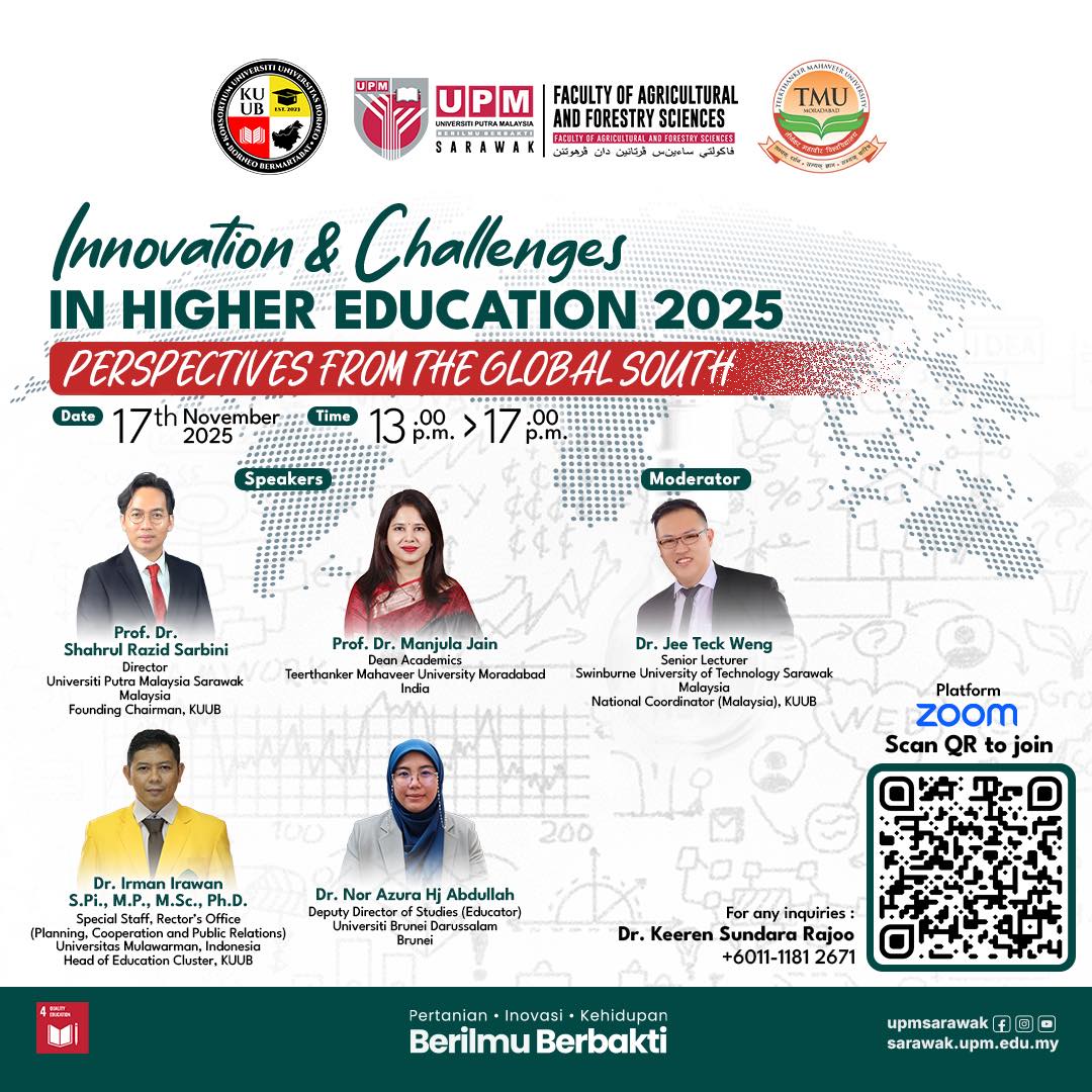 We are pleased to invite you to a virtual forum organized by Faculty of Agricultural and Forestry Sciences (FSPH), with collaboration with Konsortium Universiti Universitas Borneo (KUUB) and Teerthanker Mahaveer University (TMU). Join us for an engaging session with four distinguished speakers from Malaysia, Indonesia, Brunei, and India as they share insights on the latest challenges and innovations in higher education within their countries. This online forum will also explore emerging trends and key developments in higher education from the perspective of the Global South.