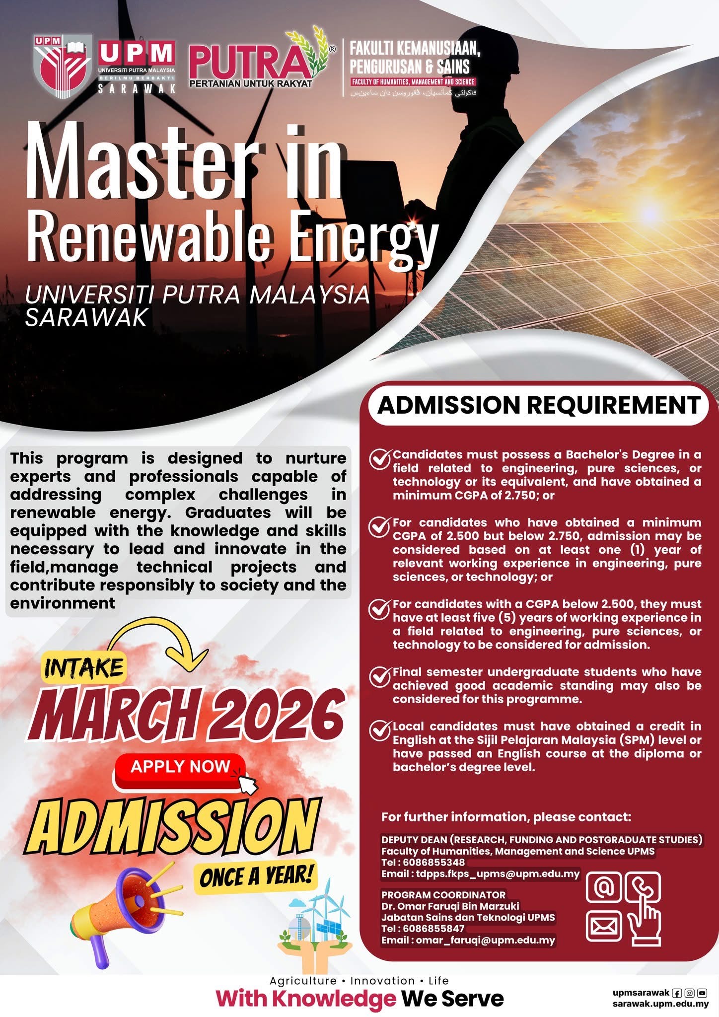 Universiti Putra Malaysia Sarawak (UPMS) kini membuka permohonan bagi program Sarjana Tenaga Boleh Diperbaharui (MRE) untuk Ambilan Oktober 2025