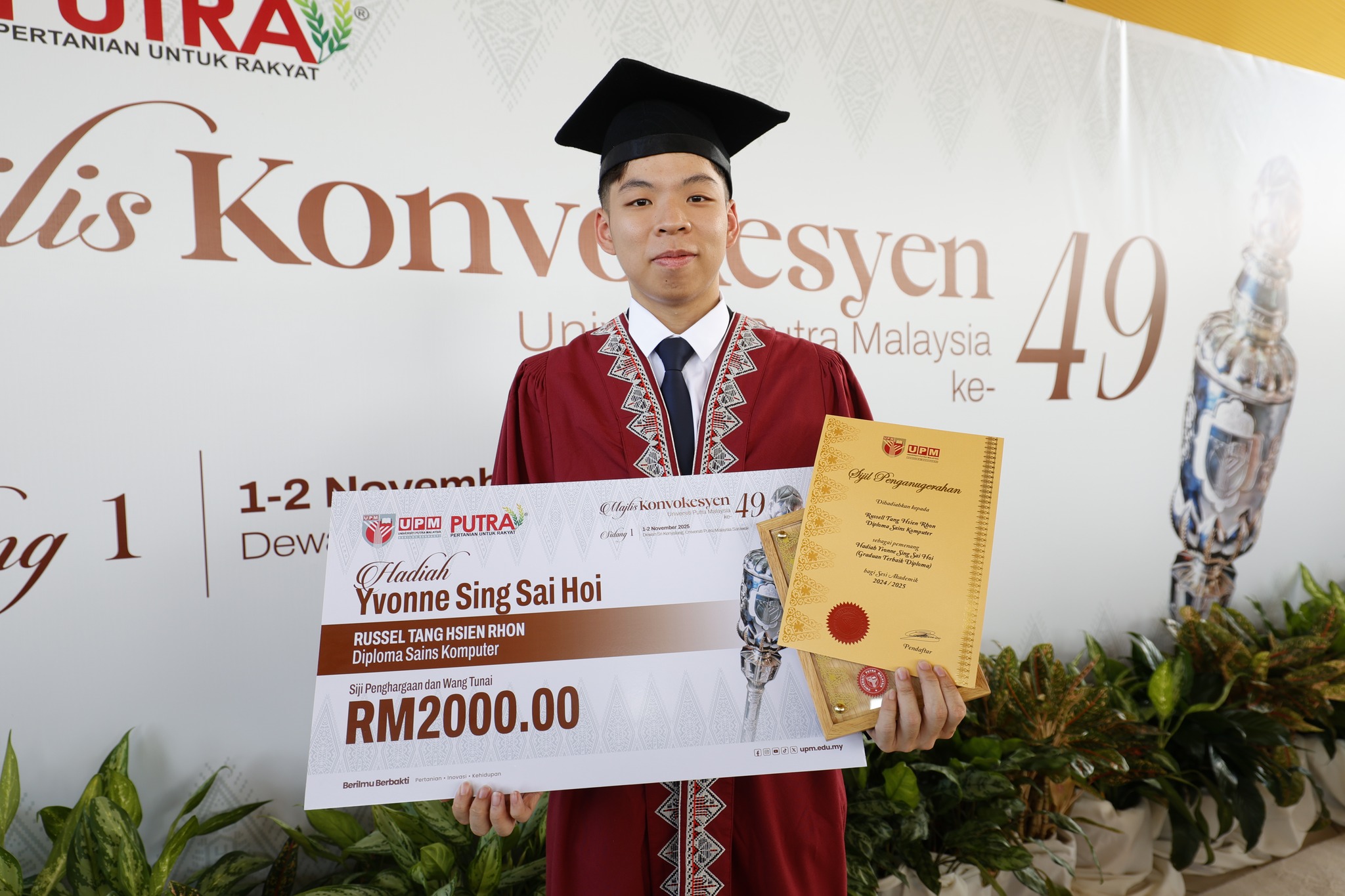 Russell Tang Hsien Rhon, penerima Hadiah Yvonne Sing Sai Hoi (Graduan Diploma Terbaik) Majlis Konvokesyen UPM ke-49 Sidang 1, menyifatkan pengalaman menuntut di Universiti Putra Malaysia Sarawak (UPMS) sebagai perjalanan yang membentuk jati diri dan keperibadiannya. Graduan Diploma Sains Komputer dari Fakulti Kemanusiaan, Pengurusan dan Sains (FKPS) itu berkata pengiktirafan diterimanya merupakan hasil ketekunan serta pengorbanan sepanjang pengajian di kampus Bintulu.