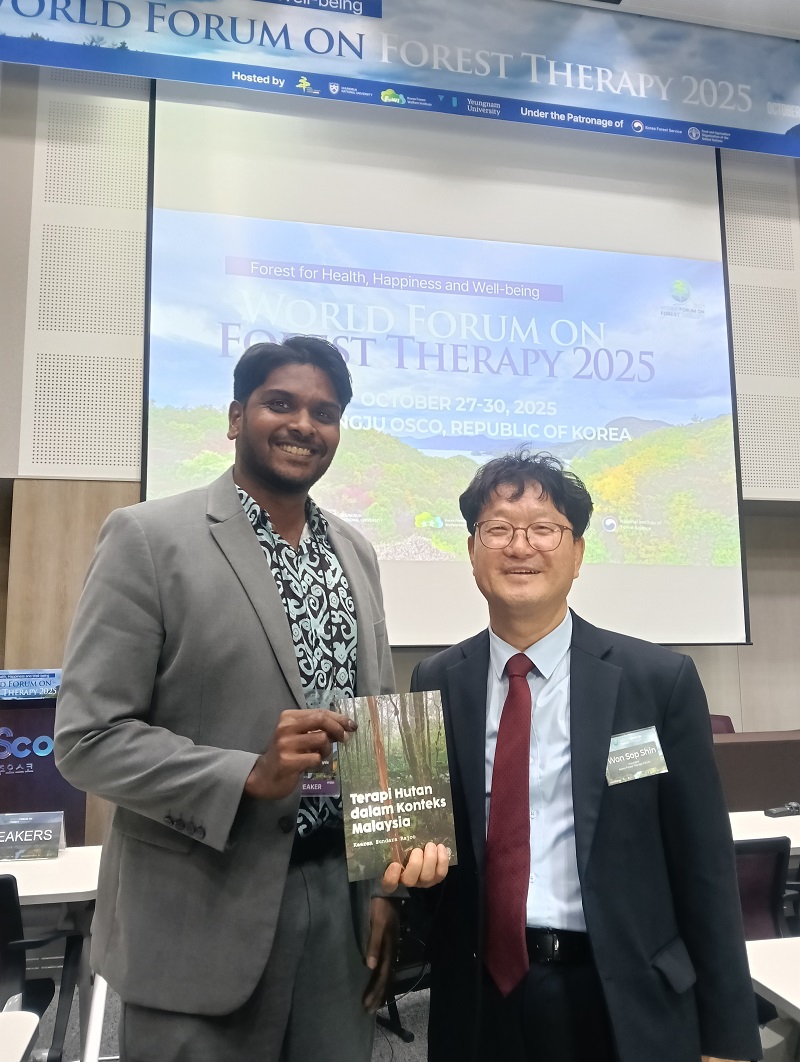 SERDANG, 13 November – Penyelidik Universiti Putra Malaysia Sarawak (UPMS), Dr. Keeren Sundara Rajoo memperkenalkan amalan tradisional “Mandi Embun”, satu bentuk terapi berasaskan alam yang berpaksikan kearifan tempatan ke peringkat antarabangsa dalam forum bertemakan “Forests for Health, Happiness and Well-being” di World Forum on Forest Therapy 2025 (WFoFT 2025) di Korea Selatan, baru-baru ini.