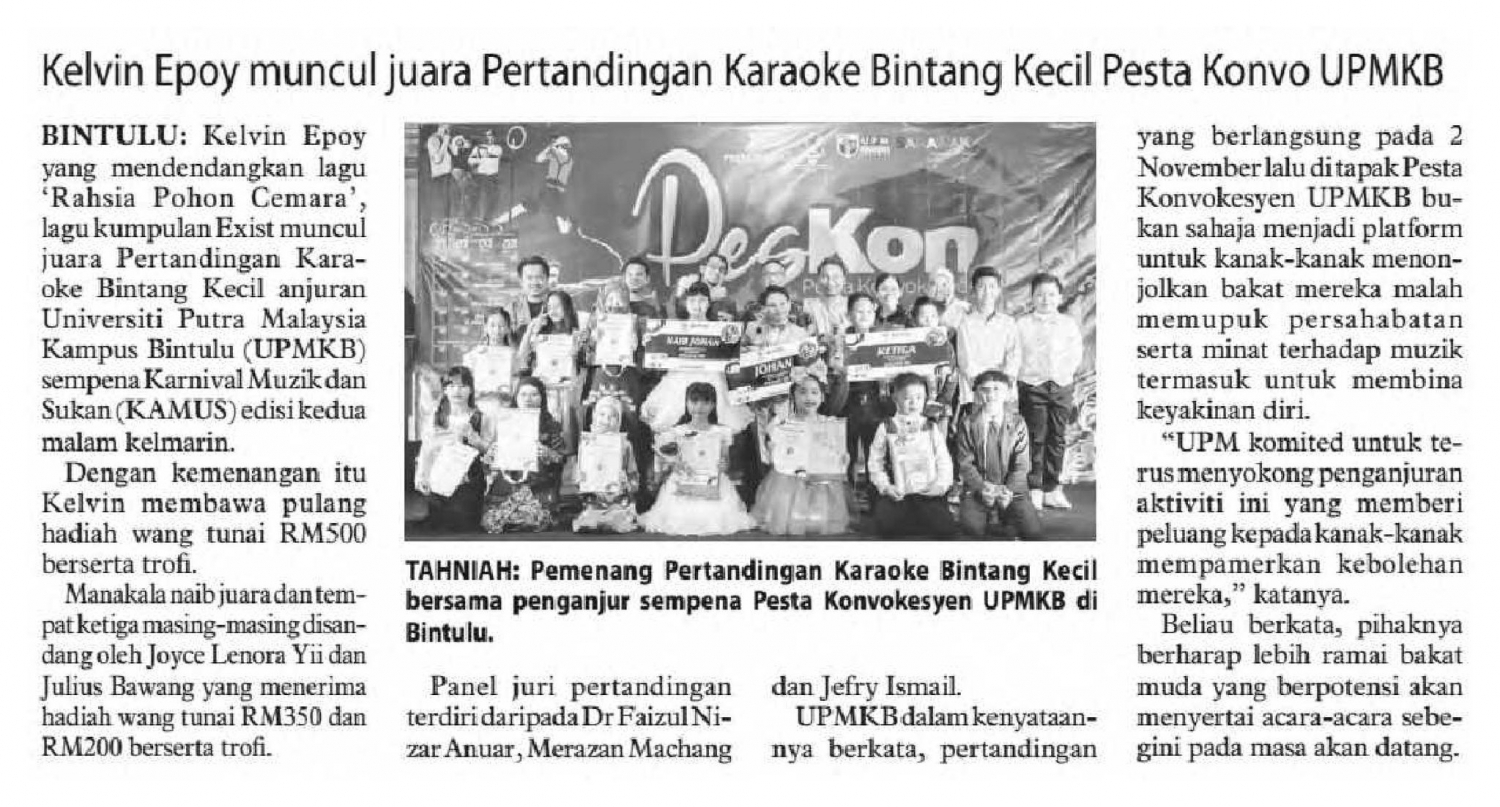 Kelvin Epoy Muncul Juara Pertandingan Karaoke Bintang Kecil Pesta Konvo UPMKB | UNIVERSITI PUTRA MALAYSIA SARAWAK